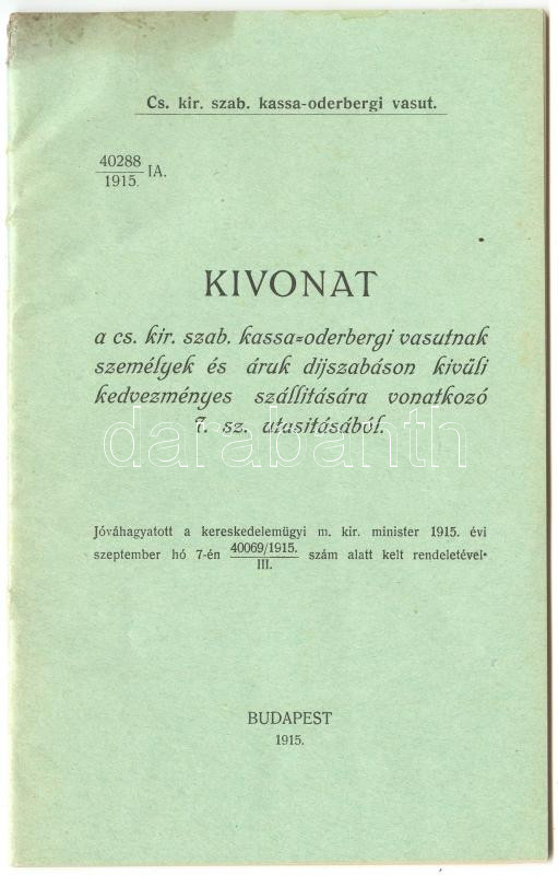 1915 Kivonat a cs. kir. szab. kassa-oderbergi vasutnak személyek és ár... https://www.darabanth.com/de/164-Fernauktion/164.0/Andere-Sammelgebiete/Drucksachen~500026/1915-Kivonat-a-cs-kir-szab-kassa-oderbergi-vasutnak-szemelyek-es-aruk-diszabason-kivuli-ke~II538892