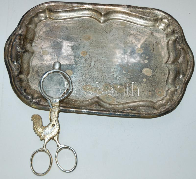 Beschreibung: Kakasos lágytojásvágó-olló 14cm és egy fém kis tálca 16c25cm