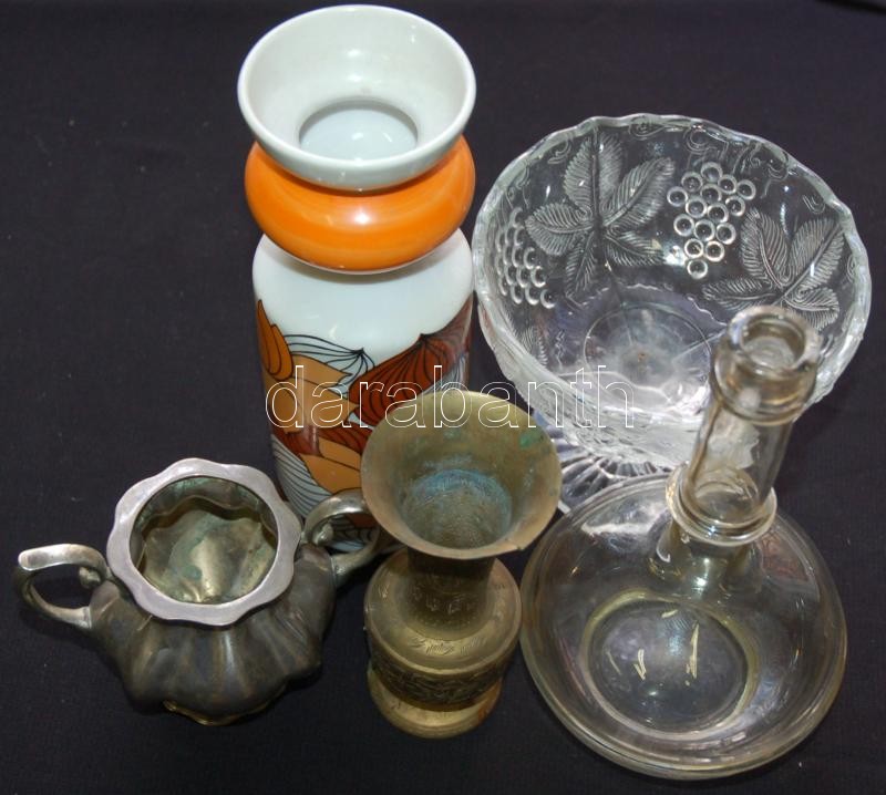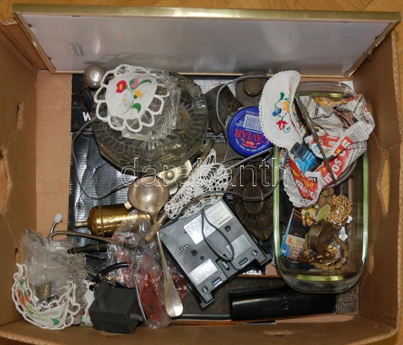 Beschreibung: Nagy vegyes bolhapiac tétel üveg-, alpakka- és réztárgyakkal, különféle érdekességgel