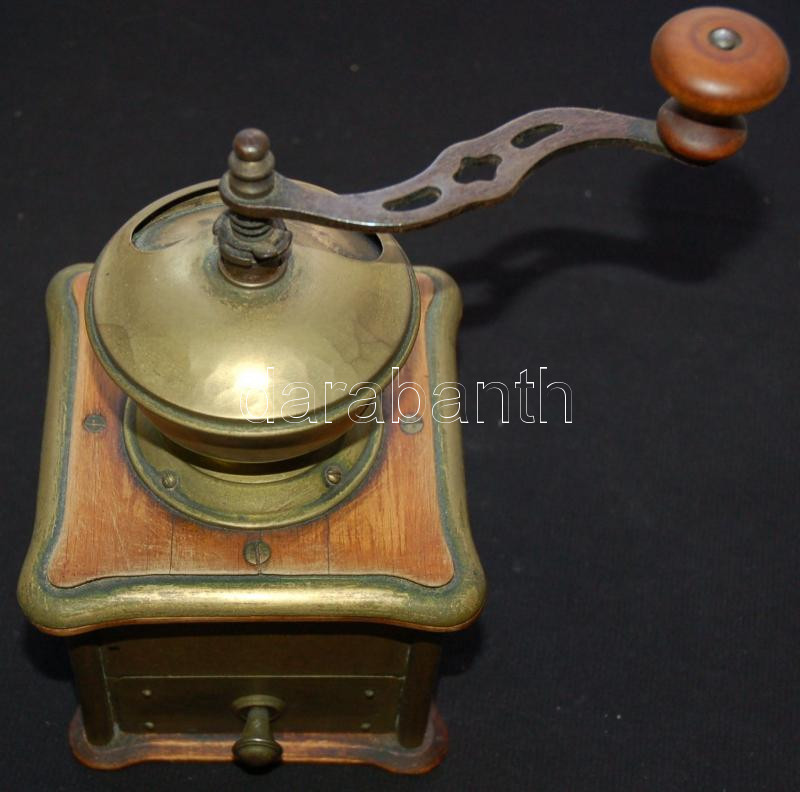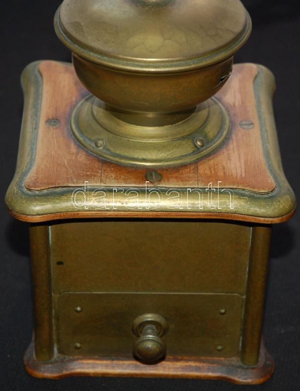 Vintage wood and brass coffee grinder with engraved decorations (grinder part broken) 26x13x13cm