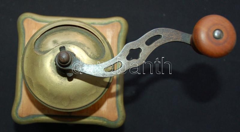 Nagyméretű régi, gravírozott jelenetekkel díszített, fa és réz kávédaráló (a daráló részén repedéssel) /