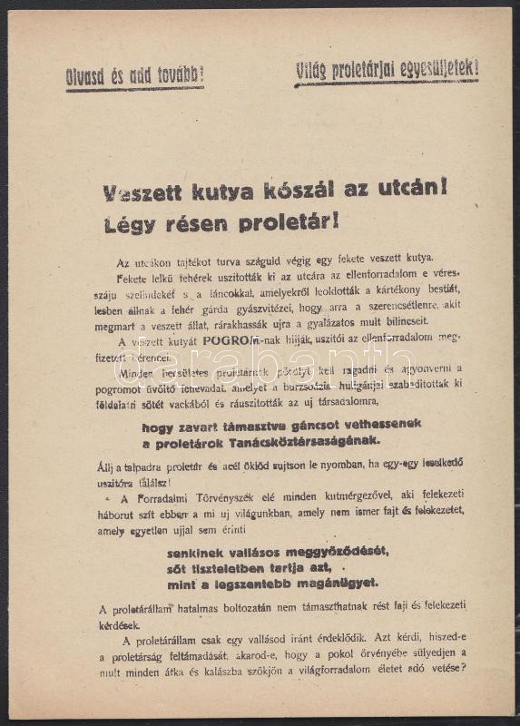 1919 Tanácsköztársasági röplap: a pogromok ellen 4p. https://www.darabanth.com/de/164-Fernauktion/164.0/Andere-Sammelgebiete/Historische-Dokumenten-Handschriften~500016/1919-Tanacskoztarsasagi-roplap-a-pogromok-ellen-4p~II536503