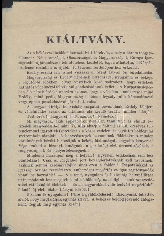 1940 Röplap Erdély visszacsatolásának alkalmából minden néphez https://www.darabanth.com/de/164-Fernauktion/164.0/Andere-Sammelgebiete/Historische-Dokumenten-Handschriften~500016/1940-Roplap-Erdely-visszacsatolasanak-alkalmabol-minden-nephez~II536526