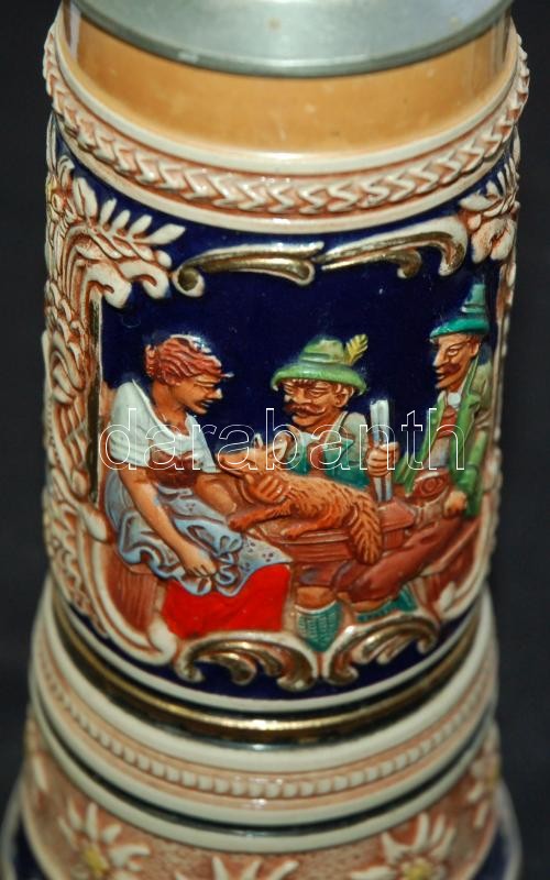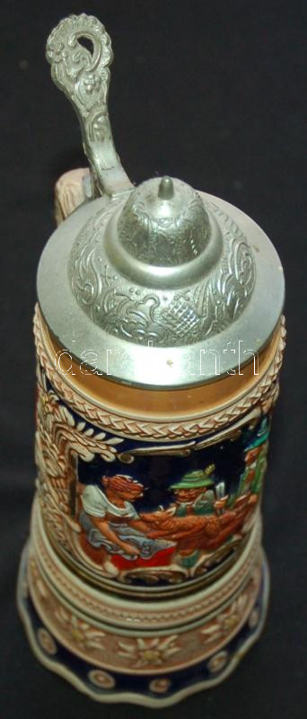 Kézzel festett domborműves díszítésű, ónfedelű söröskupa, az aljában beépített kis zenélő szerkezettel /
