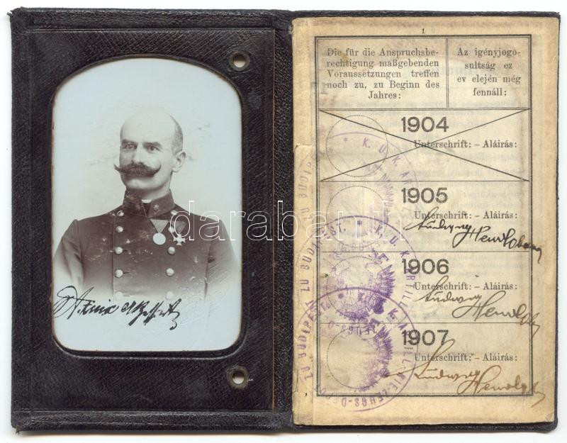 1904 Katona fényképes utazási igazolványa vonatra / Picture train id o... https://www.darabanth.com/de/164-Fernauktion/164.0/Andere-Sammelgebiete/Militaria~500024/1904-Katona-fenykepes-utazasi-igazolvanya-vonatra-Picture-train-id-of-kuk-soldier~II536476