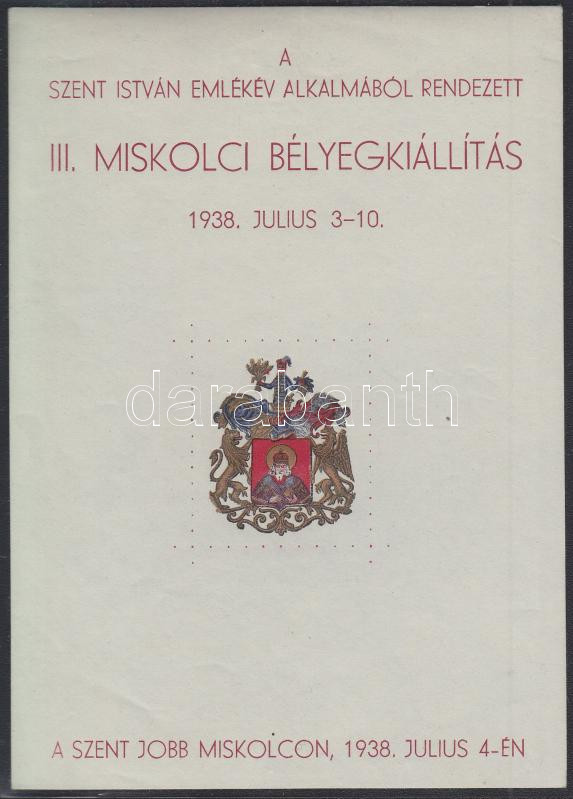 Beschreibung: 1938 A Szent István emlékév alkalmából rendezett III. Miskolci Bélyegkiállítás emlékblokk