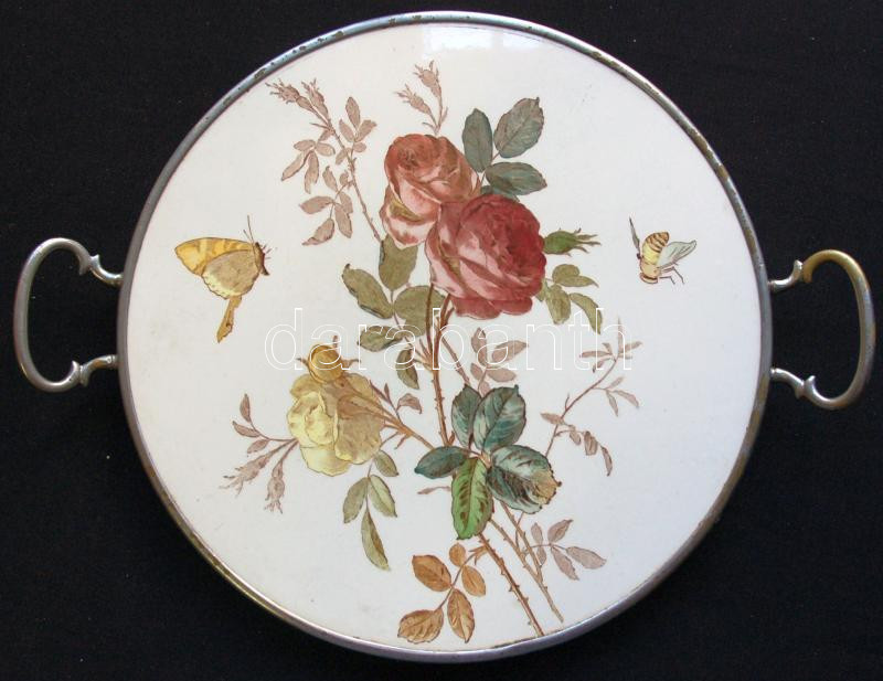 Beschreibung: Fémkeretű, díszes porcelán tálca /