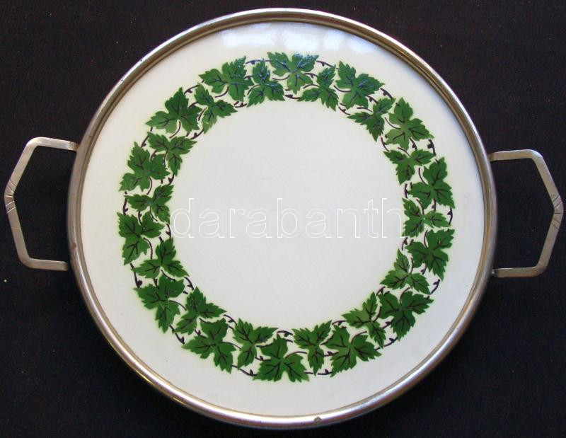 Beschreibung: Fémkeretű, szőlőlevelekkel díszített porcelán tálca /