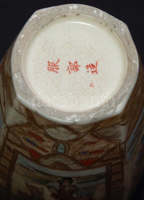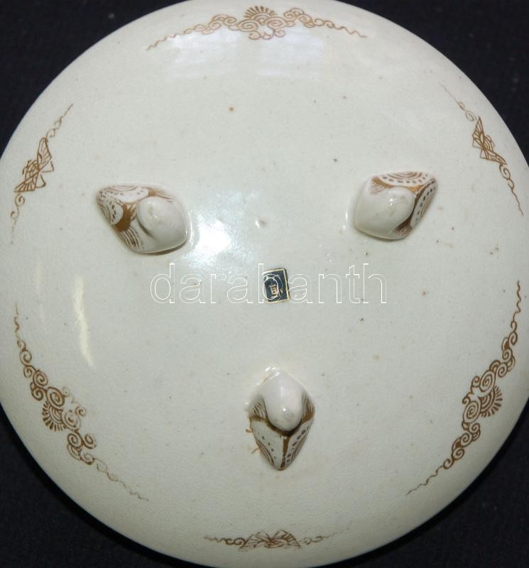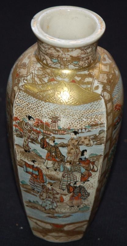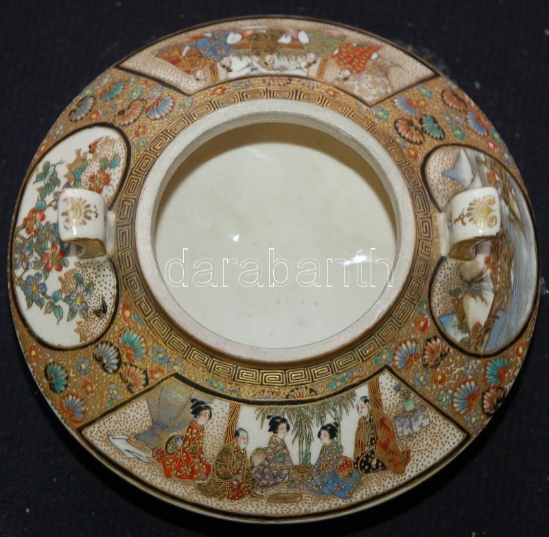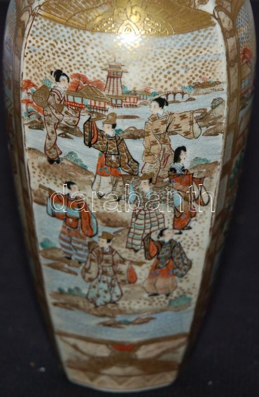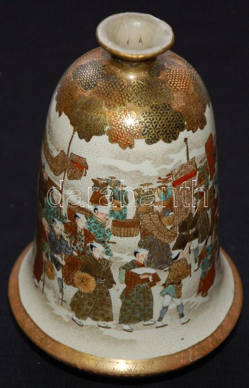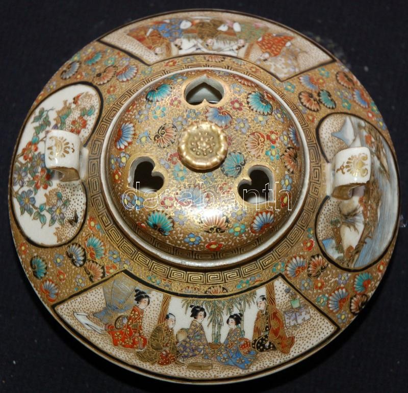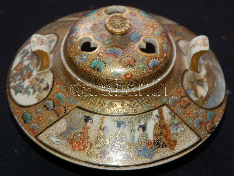Miniatűr jelenetekkel díszített, gazdagon aranyozott, kézzel festett, jelzett japán porcelán vázák egy illatosító-tartó edénykével. Szép állapotban (az egyik váza száján kis repedés) /