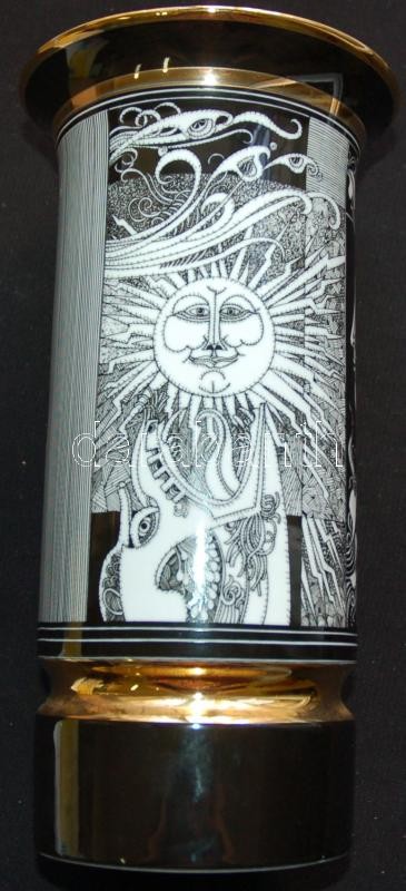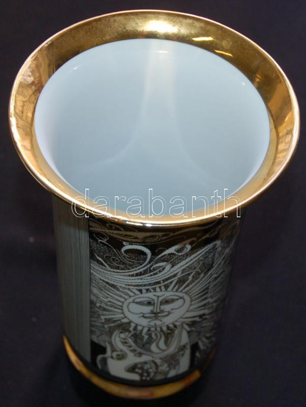 Beschreibung: Szász Endre által tervezett aranyozott jelzett Hollóházi porcelán váza. arcok sorozat / Faces designed by Endre Szasz Hollóháza chinaware vase 20cm