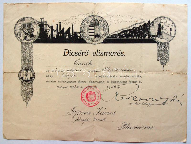 Beschreibung: 1924 Rakovszky István m. kir belügyminiszter saját kezű aláírása bányász dícsérő oklevélen