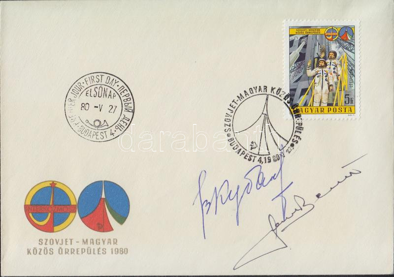 1980 Szovjet-Magyar közös űrrepülés FDC Farkas Bertalan és Valerij Kubaszov magyar és szovjet űrhajós aláírásával / Intercosmos FDC with original autograph of 2 astronauts