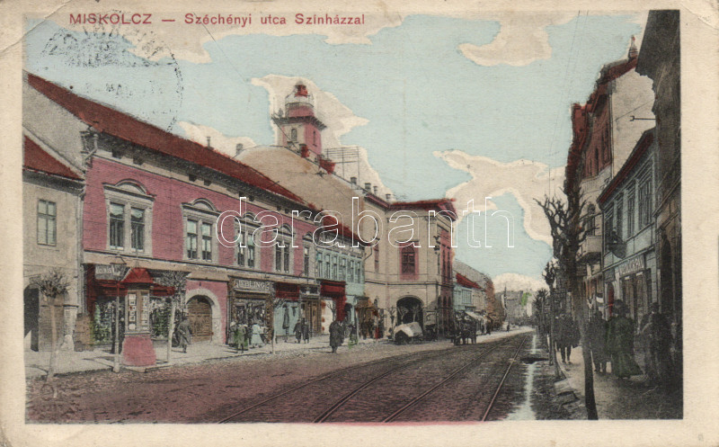 Beschreibung: Miskolc Széchenyi utca, Színház, Weidlich Pál, illetve Liebling üzlete, Bútor és szőnyeg kereskedés (EK)