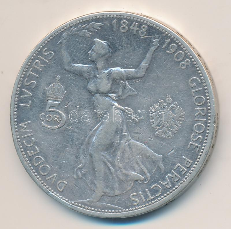 Austria 1908. 5 Corona Ag "Jublile... https://www.darabanth.com/de/164-Fernauktion/164.0/Numismatik/Auslandische-Munzen~2000106/Ausztria-1908-5K-Ag-Jubileum-T3-3Cbr3EAustria-1908-5-Corona-Ag-Jublilee-CF~II539259