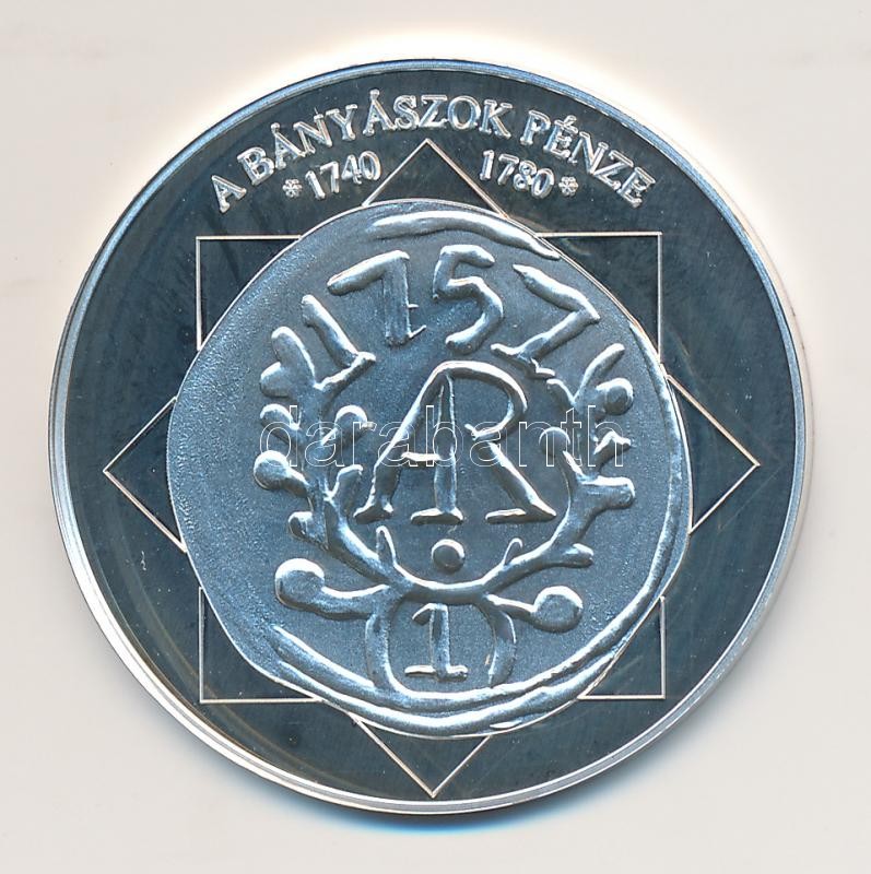 Beschreibung: DN "A magyar nemzet pénzérméi - A bányászok pénze 1740-1780." Ag (0,999) emlékérem (10,37g/35mm) T:PP tanúsítvánnyal!
