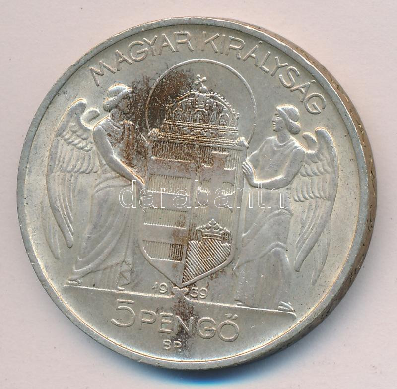 1939. 5P Ag "Horthy - balra" T:2 ph. https://www.darabanth.com/de/164-Fernauktion/164.0/Numismatik/Ungarische-Munzen~2000102/1939-5P-Ag-Horthy--balra-T2-ph~II536740