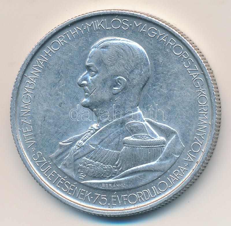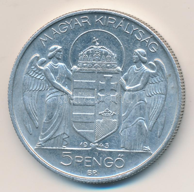 1943. 5P "Horthy Miklós születésének 75. évfordulója" Alu T:2 https://www.darabanth.com/de/164-Fernauktion/164.0/Numismatik/Ungarische-Munzen~2000102/1943-5P-Horthy-Miklos-szuletesenek-75-evforduloja-Alu-T2~II535643