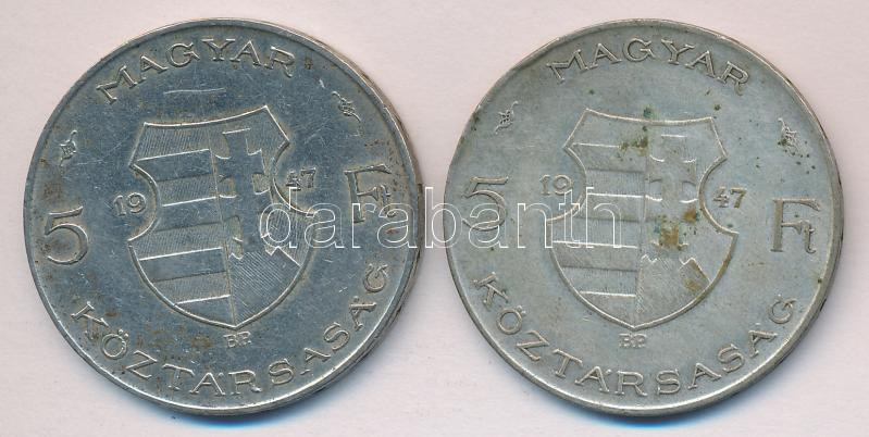 1947. 5FT Ag "Kossuth" (2x) T:2-,3 https://www.darabanth.com/de/164-Fernauktion/164.0/Numismatik/Ungarische-Munzen~2000102/1947-5FT-Ag-Kossuth-2x-T2-3-3Cbr3E~II542725