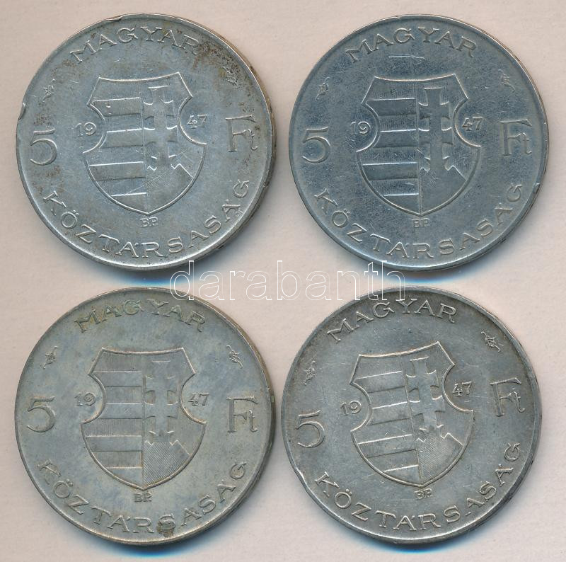 1947. 5FT Ag "Kossuth" (4x) T:2-,3 https://www.darabanth.com/de/164-Fernauktion/164.0/Numismatik/Ungarische-Munzen~2000102/1947-5FT-Ag-Kossuth-4x-T2-3-3Cbr3E~II542722