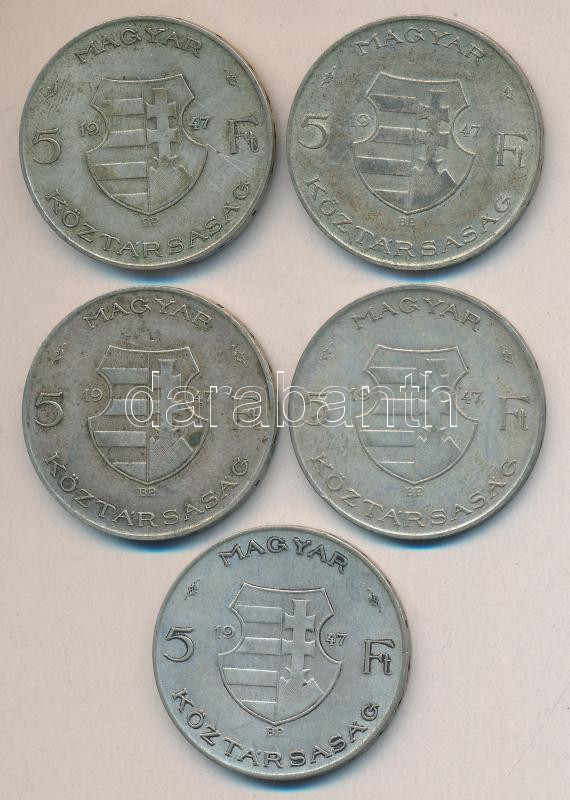 1947. 5FT Ag "Kossuth" (5x) T:3 https://www.darabanth.com/de/164-Fernauktion/164.0/Numismatik/Ungarische-Munzen~2000102/1947-5FT-Ag-Kossuth-5x-T3-3Cbr3E~II542730
