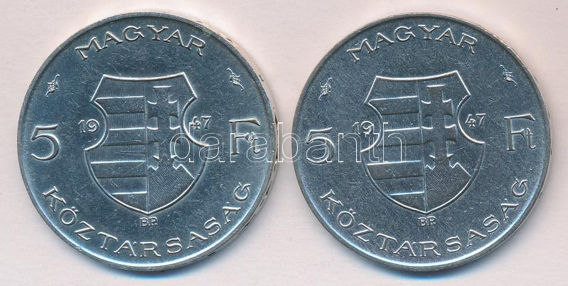 1947. 5Ft Ag "Kossuth" (2x) T:2 https://www.darabanth.com/de/164-Fernauktion/164.0/Numismatik/Ungarische-Munzen~2000102/1947-5Ft-Ag-Kossuth-2x-T2~II537912