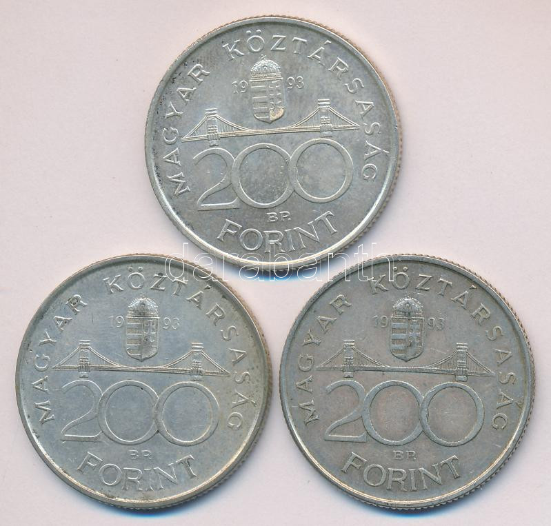 1993. 200Ft Ag "MNB" (3x) T:2 https://www.darabanth.com/de/164-Fernauktion/164.0/Numismatik/Ungarische-Munzen~2000102/1993-200Ft-Ag-MNB-3x-T2~II542708