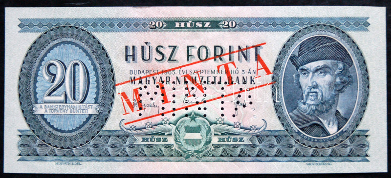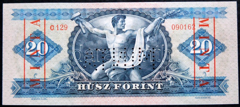 1965. 20Ft "MINTA" perforációval és felülnyomással, C 129 + számozás T... https://www.darabanth.com/de/164-Fernauktion/164.0/Numismatik/Ungarische-banknoten~2000101/1965-20Ft-MINTA-perforacioval-es-felulnyomassal-C-129-plus-szamozas-TI-felso-szel-kisse~II542456