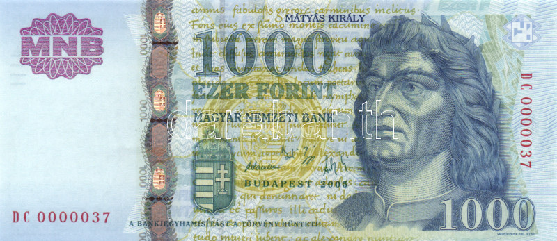 2005. 1000Ft "DC 0000037" T:I https://www.darabanth.com/de/164-Fernauktion/164.0/Numismatik/Ungarische-banknoten~2000101/2005-1000Ft-DC-0000037-TI~II542396