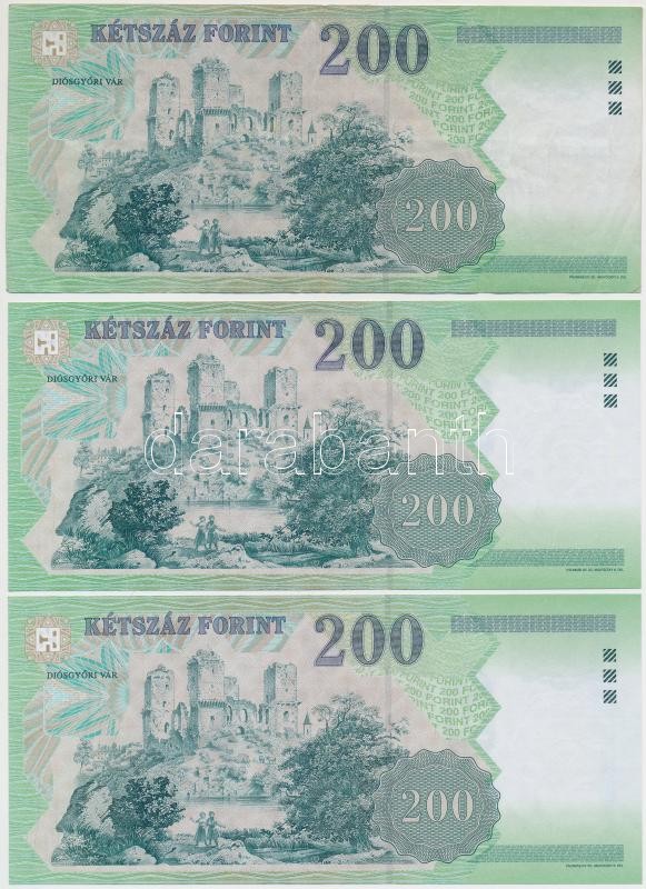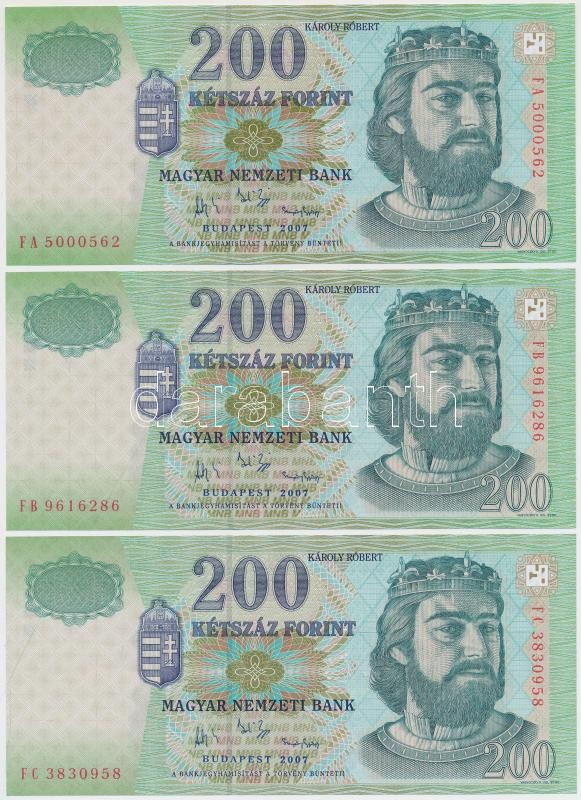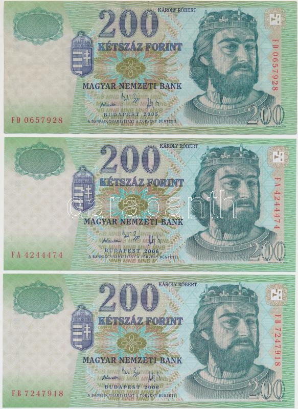 2005. 200Ft "FD" T:III + 2006. 200Ft (2x) "FA/FB" + 2007. 200Ft (3x) "... https://www.darabanth.com/de/164-Fernauktion/164.0/Numismatik/Ungarische-banknoten~2000101/2005-200Ft-FD-TIII-plus-2006-200Ft-2x-FAFB-plus-2007-200Ft-3x-FAFBFC-TI~II538732