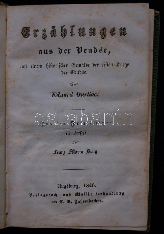 Eduard Ourliac: Erzählungen aus der Vendée. Augsburg, 1846, G. A. Fahrmbacher. Dombornyomott, aranyozott díszítésű egyedi papírkötésben a Bajor Királyság címerével, címlapmetszettel, az előzéklapon beírás a tulajdonos szignójával, Maria Hyacintha Freiin v. Gumppenberg szárazpecsétjével. A kötése megkopott, de szép állapotú /