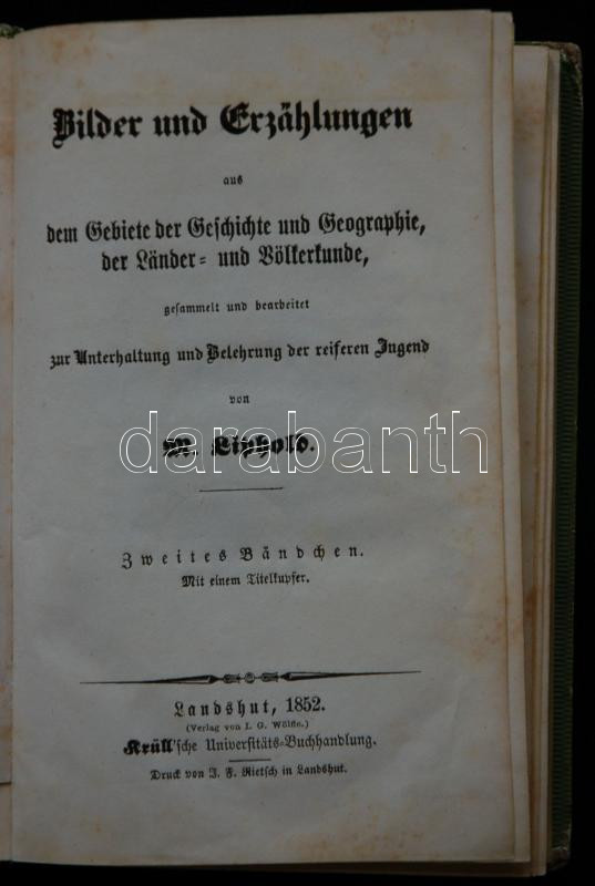 M. Liphold: Bilder und Erzählungen aus dem Gebiete der Geschichte und Geographie der Länder- und Völkerkunde zur Unterhaltung und Belehrung der reiferen Jugend, II. Bd. Landshut, 1852, Wölfe. A Bajor Királyság címerével ellátott dombornyomott, aranyozott díszítésű egyedi papírkötésben, címlapmetszettel, az előzéklapon beírás a tulajdonos szignójával, Maria Hyacintha Freiin v. Gumppenberg szárazpecsétjével. A kötése megkopott, de szép állapotú /