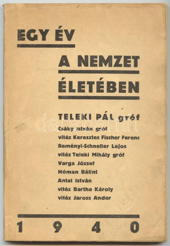 1940 Egy év a nemzet életében. Bp., 1940. Teleki Pál kormánya tagjaina... https://www.darabanth.com/de/165-Fernauktion/165.0/Andere-Sammelgebiete/Bucher-Geschichte~900033/1940-Egy-ev-a-nemzet-eleteben-Bp-1940-Teleki-Pal-kormanya-tagjainak-beszedei-211p~II546963