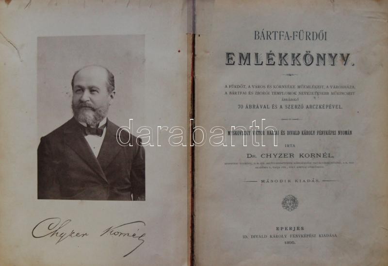 Chyzer Kornél, dr.: Bártfa-fürdői emlékkönyv. Második kiadás. Eperjes, 1895. Id. Divald Károly. 1t.+62+(1)p.+13+27 kihajt. t. A római számozás téves, hiány nincs. Díszesen aranyozott, kiadói vászonkötésben. A gerincen kis sérülésekkel. A kötés laza, néhány lap kijár.