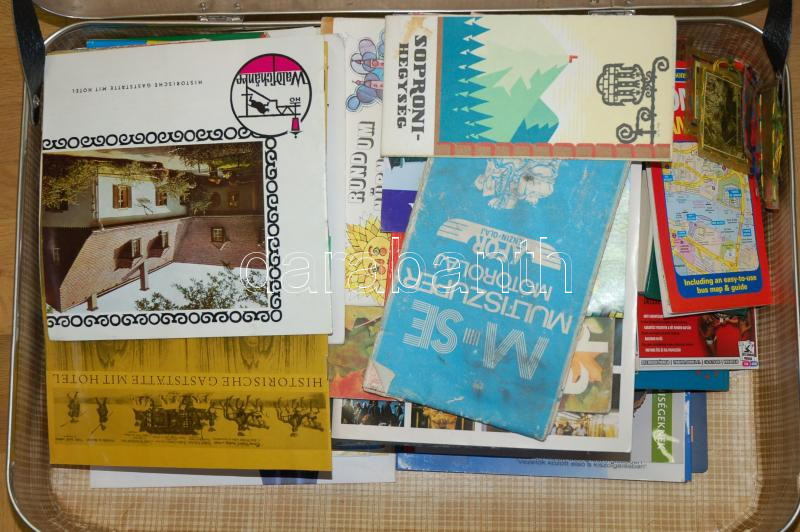 Beschreibung: Egy bőröndnyi vegyes turisztikai térkép és utazási prospektus egyéb régi nyomtatvánnyal