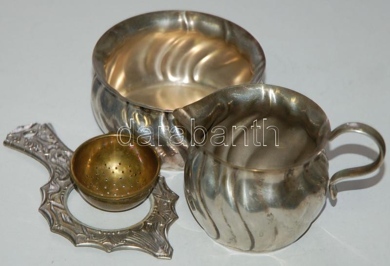 Beschreibung: Ezüstözött jelzett svéd kiöntő kis tálkával és egy kis fém teaszűrő réz betéttel
