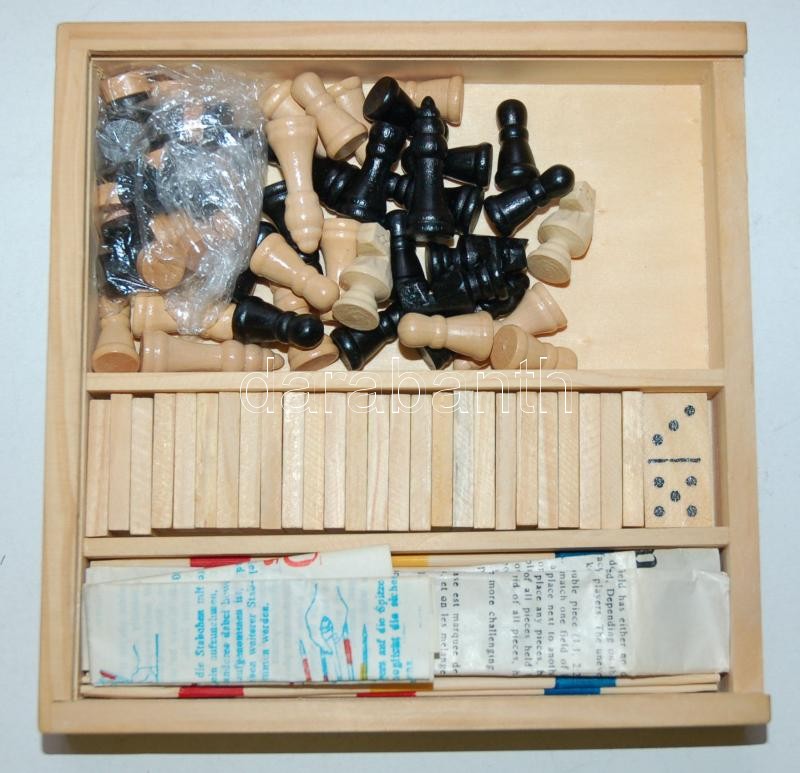Beschreibung: Fából készült útijáték készlet: sakk, dáma, dominó, marokkó