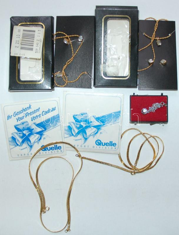 Beschreibung: Kis bizsu tétel: 2 hegyikristály nyaklánc, medál és fülbevaló garnitúra, 1 ezüstözött lánc hegyikristály medállal eredeti dobozban,2 aranyozott nyaklánc/ juwellerys with crystal
