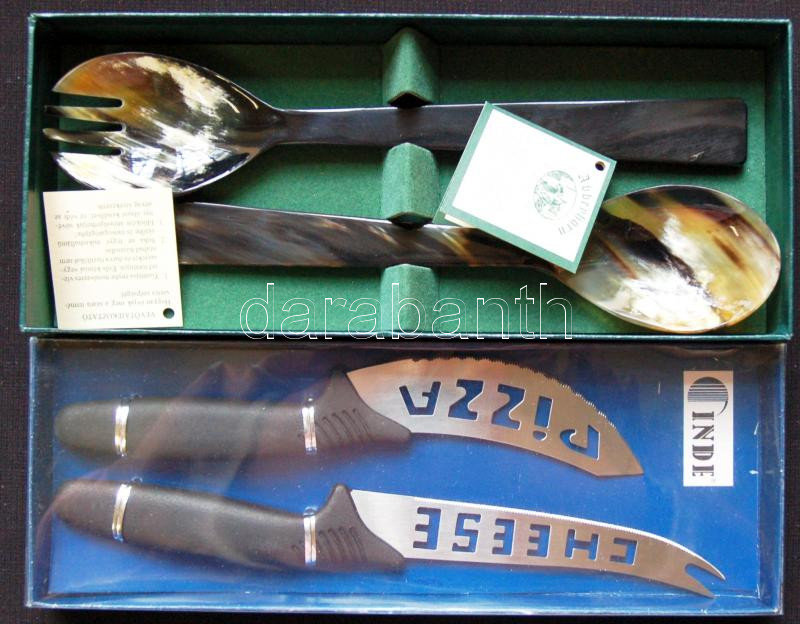 Beschreibung: Speciális spanyol pizza- és sajtvágó kés eredeti dobozában + 2db szaruból készült salátás kanál