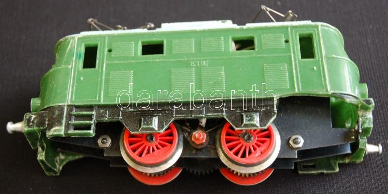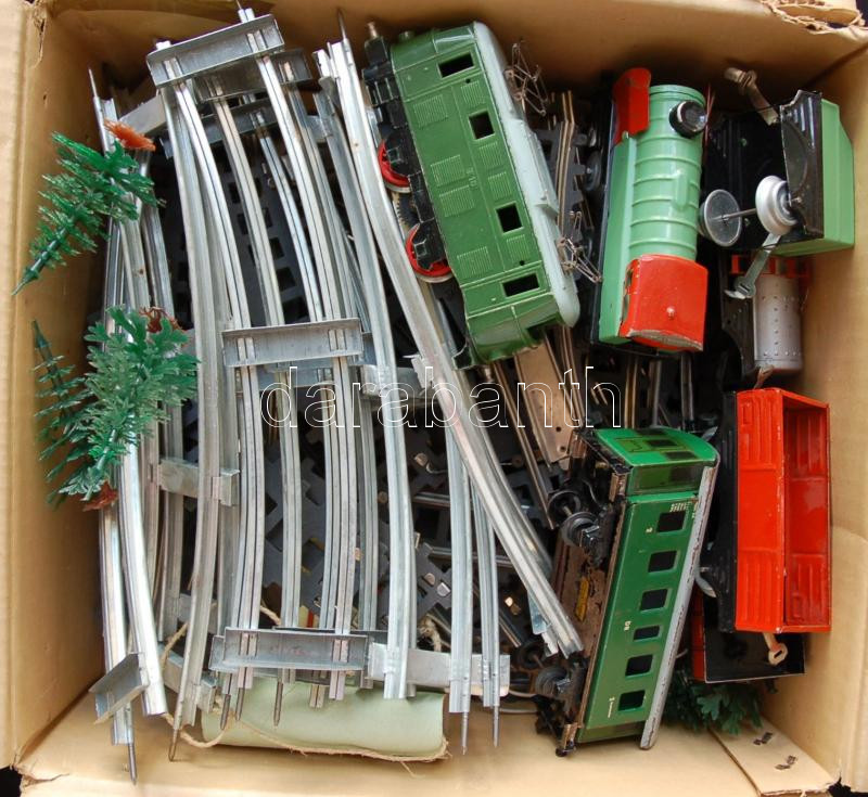 cca 1960 Mechanikus, felhúzható modellvasút készlet 2 mozdony + 5 kocsi sok hozzávaló sínnel, váltóval, kissé megviselt állapotban / Set of vintage model-trains