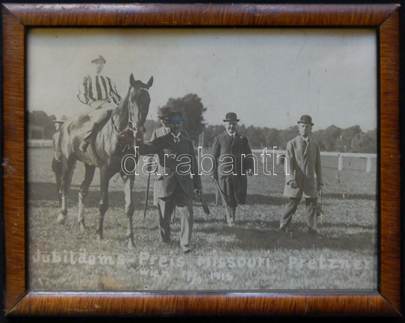 Beschreibung: 1916 Bécsi lóverseny-díjátadó fotója a győztessel üvegezett keretben /