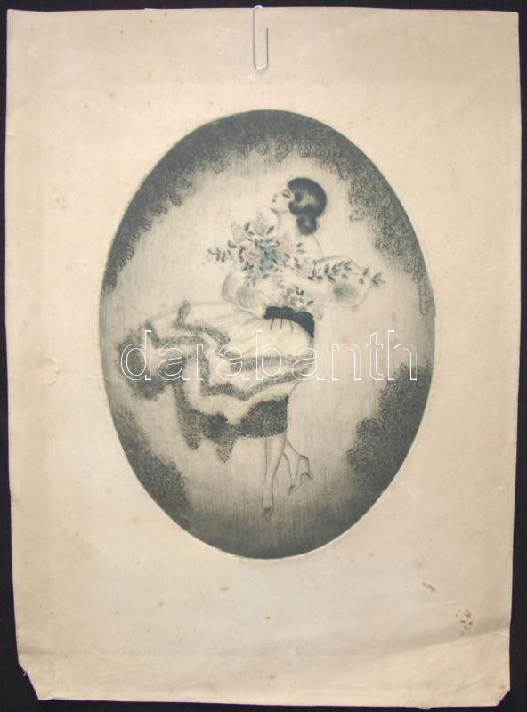 Beschreibung: Olvashatatlan jelzéssel: Nő virággal, rézkarc, papír, apró szakadás, 23×17 cm