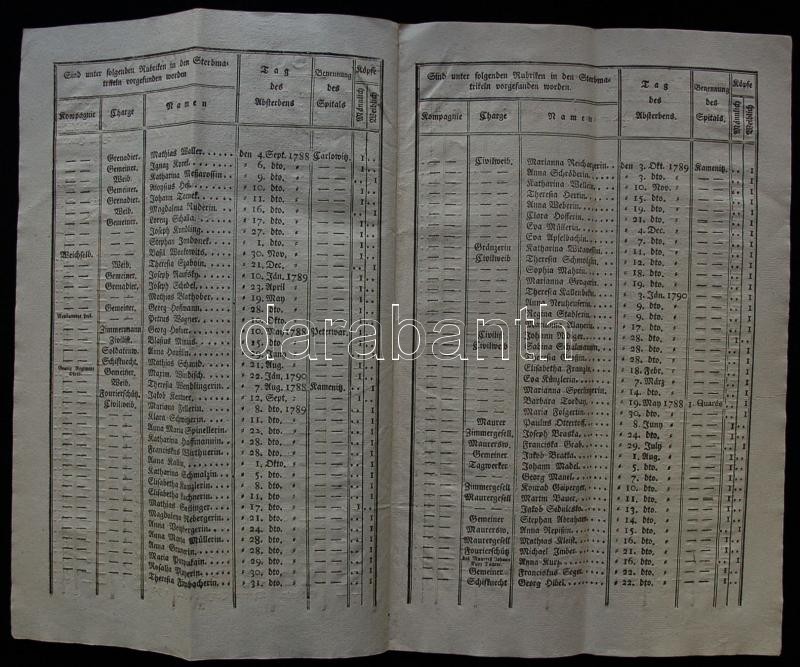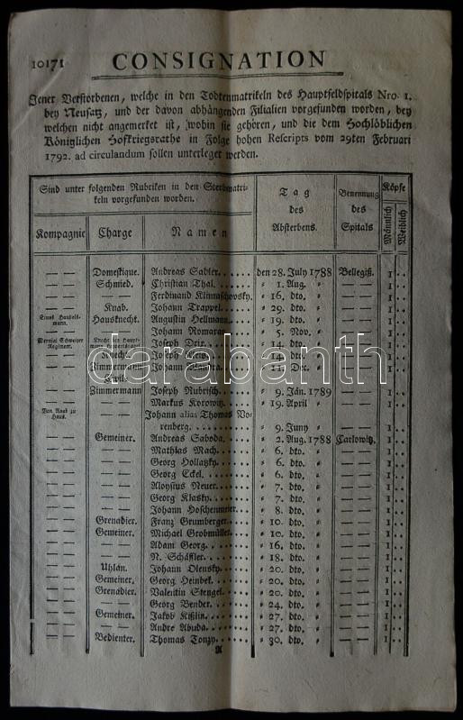 1792 Feljegyzése azon megholtaknak kik a Neusatz Uj palánkánál fekvő tábori isputály... matrikulájában meg neveztetnek... 8 nyomtatott oldal német nyelven / List of the ones died in the militay-hospital of Neusatz 8 pages printed in German