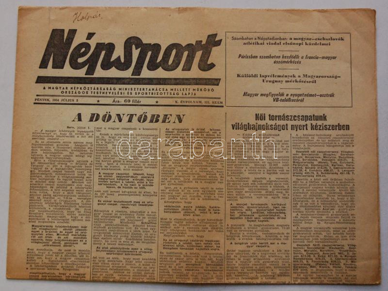 1954. július 2. Népsport: vezércikk a labdarúgó világbajnokság döntője... https://www.darabanth.com/de/165-Fernauktion/165.0/Andere-Sammelgebiete/Historische-Dokumenten-Handschriften~900015/1954-julius-2-Nepsport-vezercikk-a-labdarugo-vilagbajnoksag-dontoje-elott~II515887