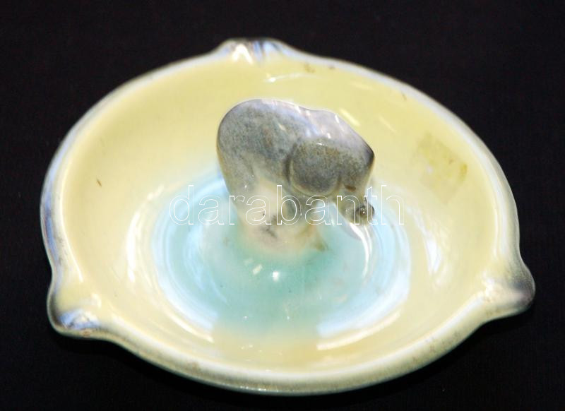 Beschreibung: Cca 1920 Art deco elefántos hamutál, jelzett, 6×15 cm, apró máz hibával