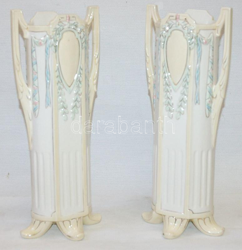 cca 1900 Kézzel festett szecessziós majolika vázapár alig észrevehető sérülésekkel (kis lepattogzás, hajszálrepedés) /