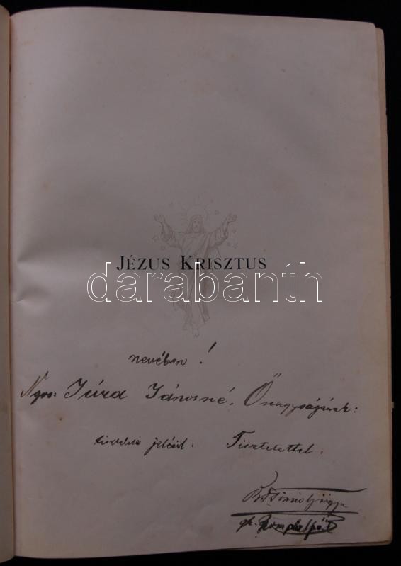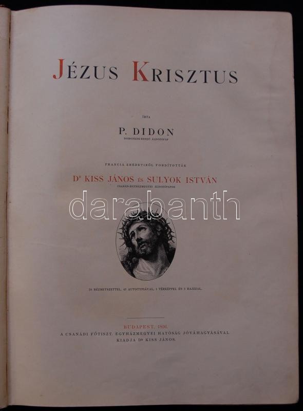 Henry P. Didon: Jézus Krisztus, ford. Kiss János és Sulyok István, Bp. 1896, Kiss János kiadása, díszkiadás, aranyozott festett egészvászon kötésben, színes selyemképpel díszítve, a gericnél sérült