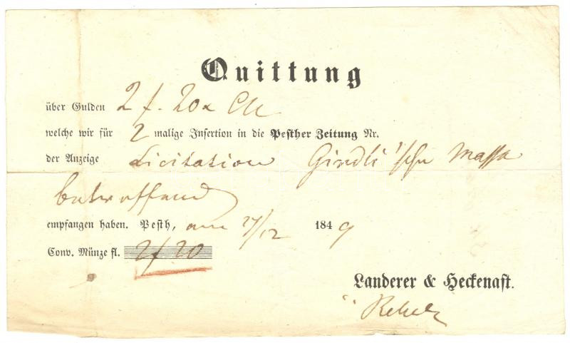 Beschreibung: 1849 A Pester Zeitung c. lapba feladott árverési hirdetmény díjának nyugtája. Landerer és Heckenast nyomda