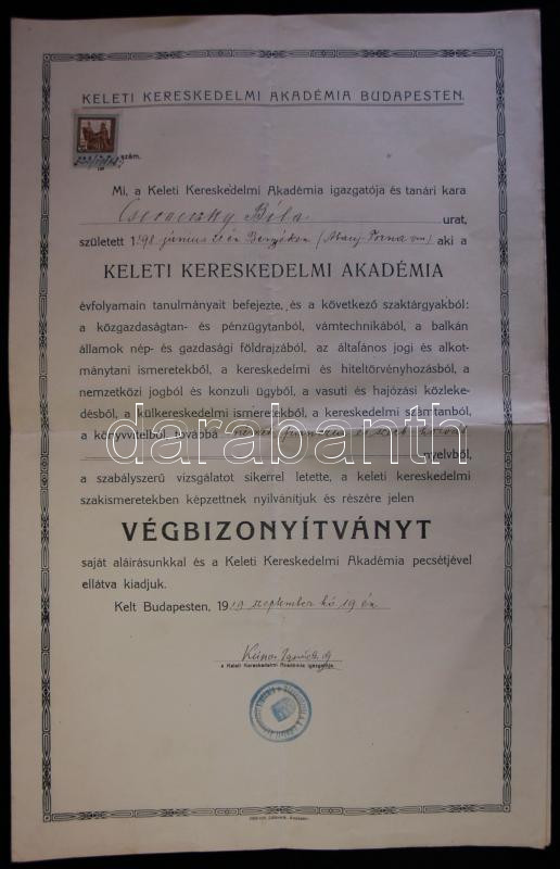 1919 Keleti Kereskedelmi Akadémia végbizonyítványa Kossuth címerrel https://www.darabanth.com/de/166-Fernauktion/166.0/Andere-Sammelgebiete/Dokument~500012/1919-Keleti-Kereskedelmi-Akademia-vegbizonyitvanya-Kossuth-cimerrel~II549141