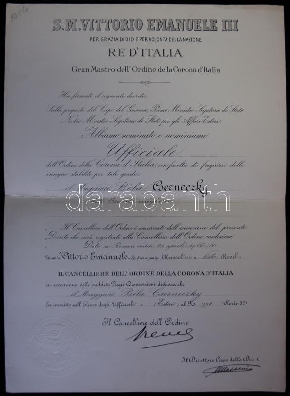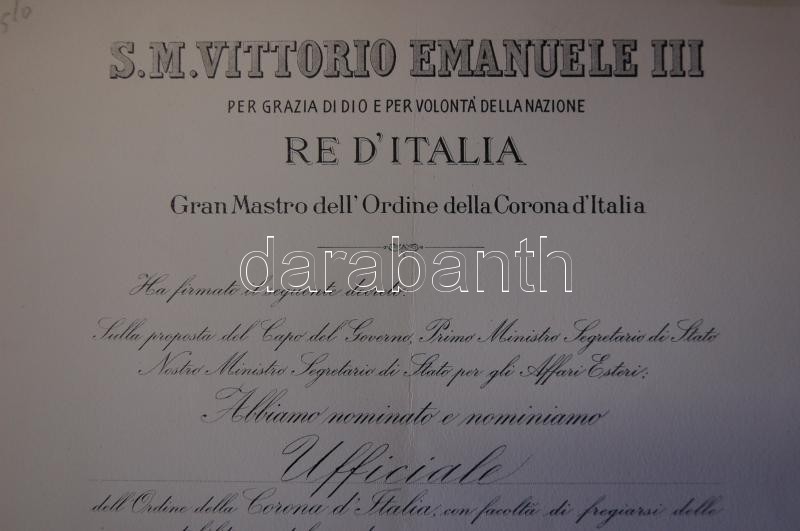 1936 Olasz korona rend oklevele magyar tiszt részére aláírásokkal https://www.darabanth.com/de/166-Fernauktion/166.0/Andere-Sammelgebiete/Dokument~500012/1936-Olasz-korona-rend-oklevele-magyar-tiszt-reszere-alairasokkal~II549147