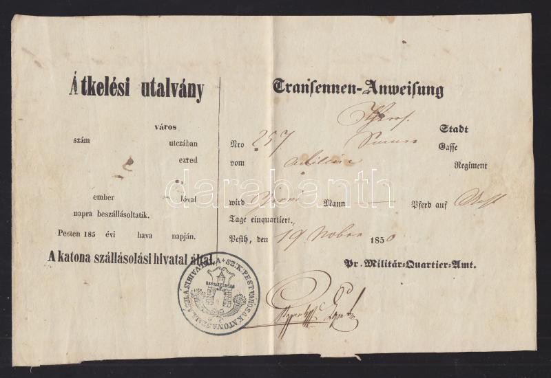 1850 Pesti katona szállásolási hivatal Átkelési utalvány https://www.darabanth.com/de/166-Fernauktion/166.0/Andere-Sammelgebiete/Drucksachen~500023/1850-Pesti-katona-szallasolasi-hivatal-Atkelesi-utalvany~II524612